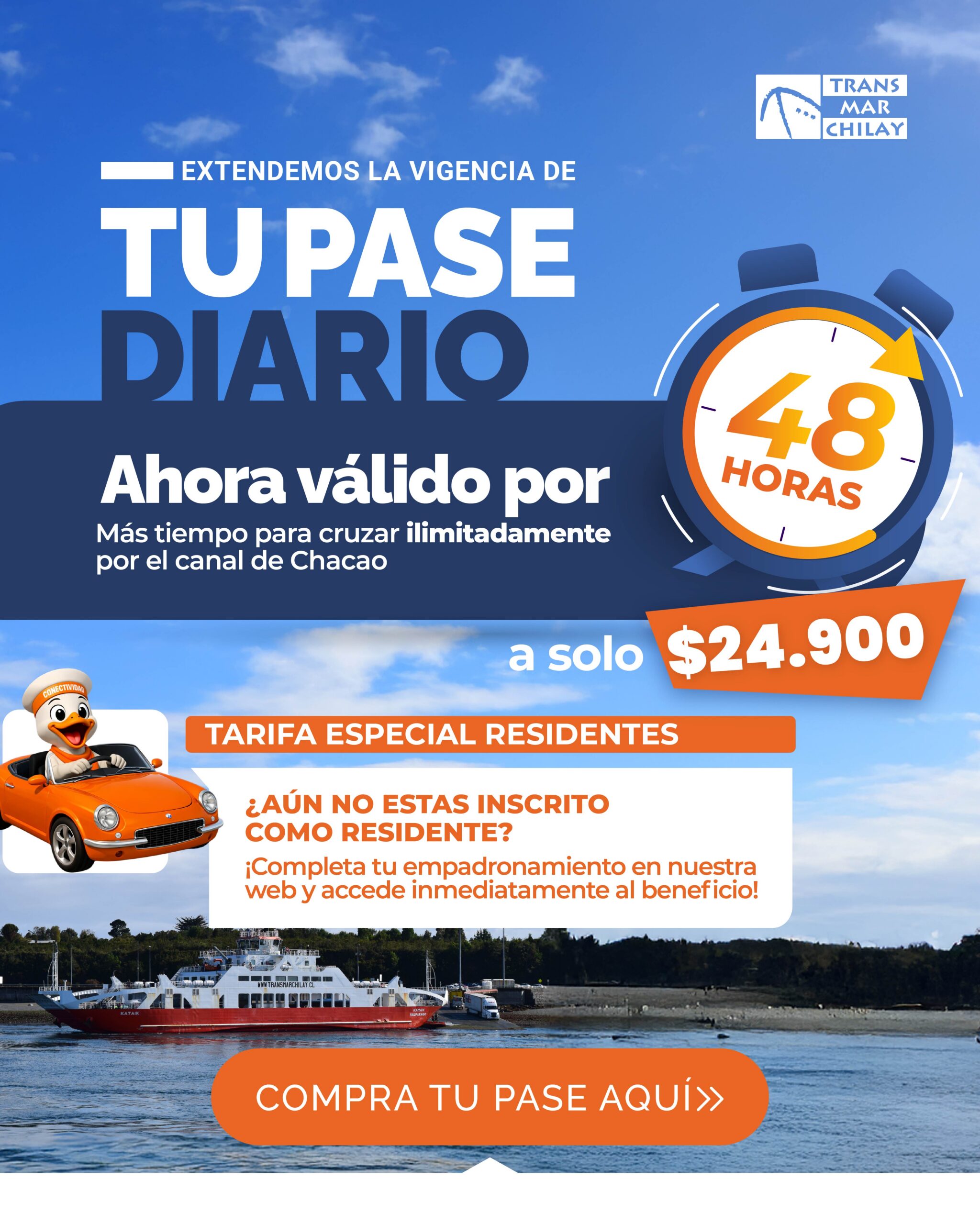 • Validación al embarque: El pase será validado al momento del embarque mediante la revisión del ticket y de los antecedentes asociados, incluyendo la patente registrada.